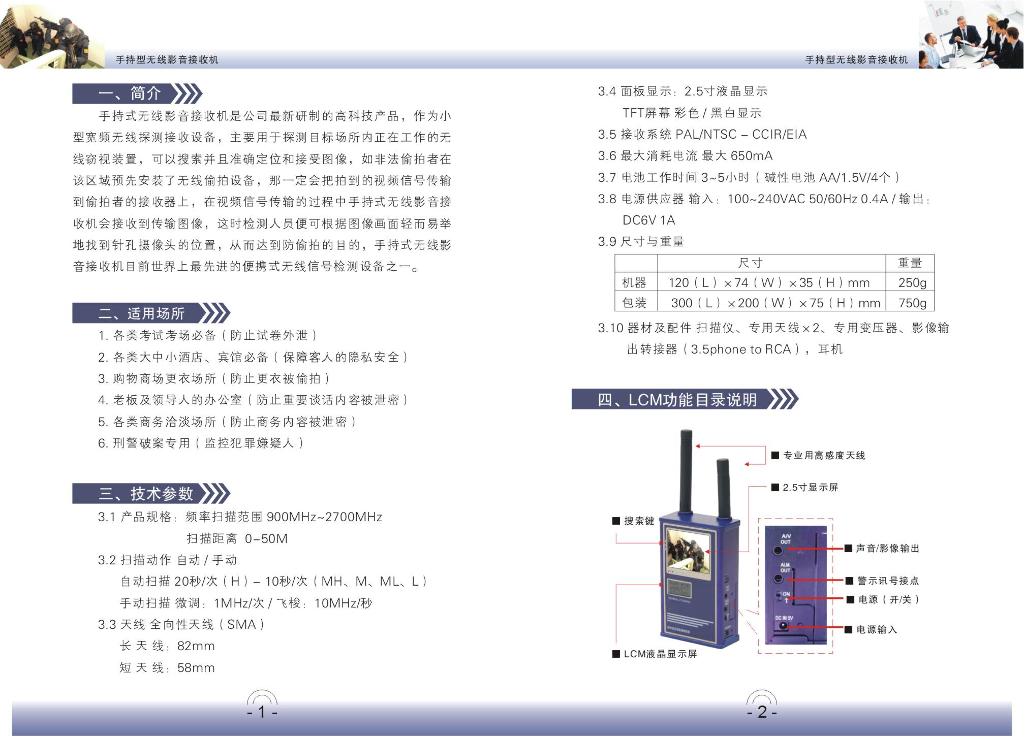 产品规格︰频率扫描范围 900MHz~2700MHz扫描动作自动 / 手动自动扫描 20 秒/次(H)- 10秒/次(MH、M、ML、L)手动扫描微调:1MHz/ 次 / 飞梭:10MHz/秒天线全向性天线(SMA )面板显示:2.5 吋液晶显示TFT 屏幕 彩色 / 黑白接收系统 PAL/NTSC - CCIR/EIA最大消耗电流最大 650mA电池工作时间 3~5 小时(碱性电池 AA/1.5V/4个)电源供应器输入:100~240VAC 50/60Hz 0.4A / 输出:5VDC 1A长天线:82mm短天线:58mm器材净重& 尺寸 120(L)×74(W)×35(H)mm(240g)总重量& 包装尺寸 220(L)×120(W)×45(H)mm(640g)器材及配件扫描仪、专用天线×2 、专用变压器、影像输出转接器(3.5phone to RCA)产品优点︰全频设计全自动扫描2.5 吋显示屏效果清晰可实时监控